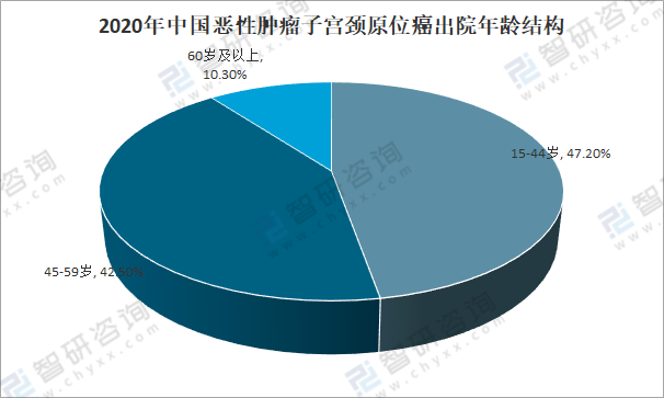 在2020年惡性腫瘤子宮頸原位癌出院病人中,15-44歲子宮頸原位癌出院病人占47.2%;45-59歲子宮頸原位癌出院病人占42.5%;60歲及以上子宮頸原位癌出院病人占10.3%。