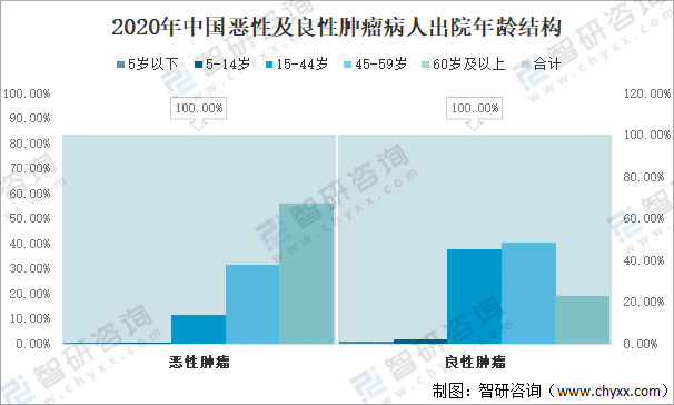 2020年中國惡性腫瘤病人60歲及以上出院人數占56.20%;45-59歲出院人數31.70%;15-44歲出院人數11.40%;5-14歲出院人數0.40%;5歲以下出院人數0.30%。良性腫瘤病人60歲及以上出院人數占19.30%;45-59歲出院人數占40.40%;15-44歲出院人數占37.70%;5-14歲出院人數占1.70%;5歲以下出院人數占0.90%。