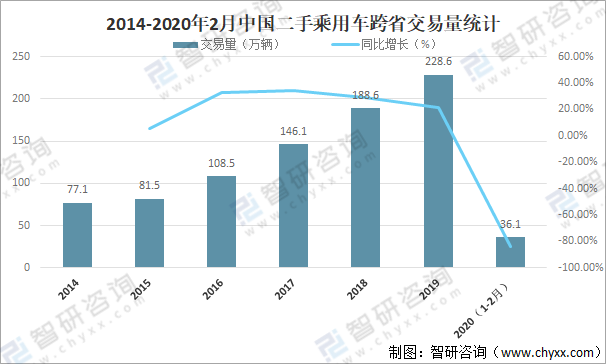 2014-2020年2月中國二手乘用車跨省交易量統計