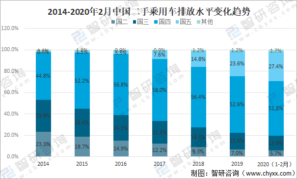 2014-2020年2月中國二手乘用車排放水平變化趨勢