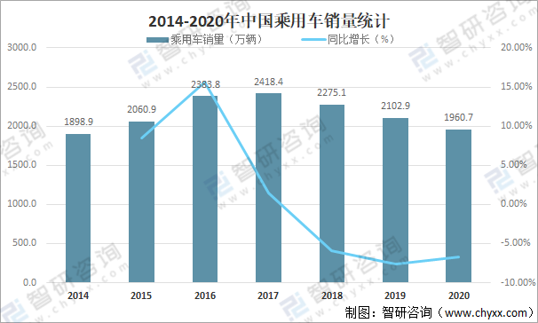 自2018年起中國乘用車銷量逐年下滑,2020年中國乘用車銷量為1960.7萬輛,較2019年減少了142.20萬輛,同比減少6.76%。