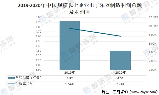 2020年中國(guó)規(guī)模以上電子樂器制造企業(yè)利潤(rùn)額有所下降,利潤(rùn)總額為4.31億元,較2019年的4.92億元同比下降12%;利潤(rùn)率為7.74%,較2019年下降了1.8個(gè)百分點(diǎn)。