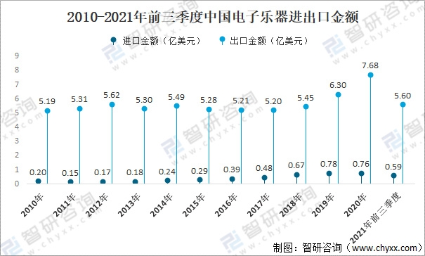 2010-2021年前三季度中國(guó)電子樂器進(jìn)出口金額