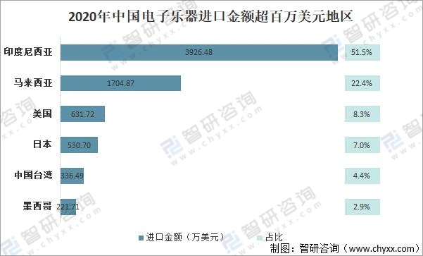 2020年中國(guó)電子樂器主要從印度尼西亞進(jìn)口,進(jìn)口金額為3926.48萬(wàn)美元,占比達(dá)51.5%;其次從馬來(lái)西亞進(jìn)口,進(jìn)口金額為1704.87萬(wàn)美元,占比22.4%。其次從美國(guó)、日本、中國(guó)臺(tái)灣、墨西哥等地進(jìn)口,上述四地進(jìn)口金額均超百萬(wàn)美元。