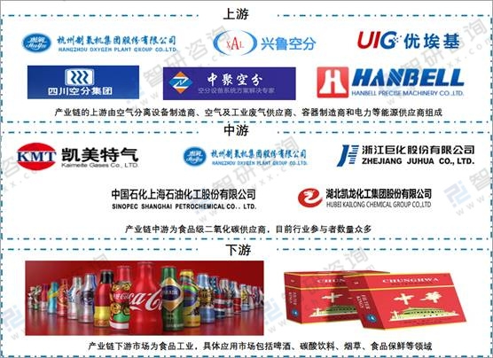 中國食品級二氧化碳產業鏈由上至下可分為上游原材料和設備制造商、中游食品級二氧化碳生產商和下游應用行業。