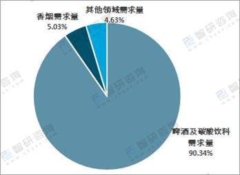 從占比情況來看,啤酒及碳酸飲料領域的食品級二氧化碳需求仍然占據最大比重,達90.34%,香煙領域需求量占比5.03%,其他領域應用合計占比4.63%。