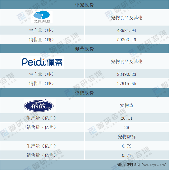 2020年中寵股份寵物食品及其他產(chǎn)品生產(chǎn)量為48931.94噸,銷售量為59203.49噸。2020年佩蒂股份寵物食品及其他產(chǎn)品生產(chǎn)量為28490.23噸,銷售量為27915.65噸。2020年依依股份寵物墊生產(chǎn)量為26.11億片,銷售量為26億片;寵物尿褲生產(chǎn)量為0.79億片,銷售量為0.77億片。