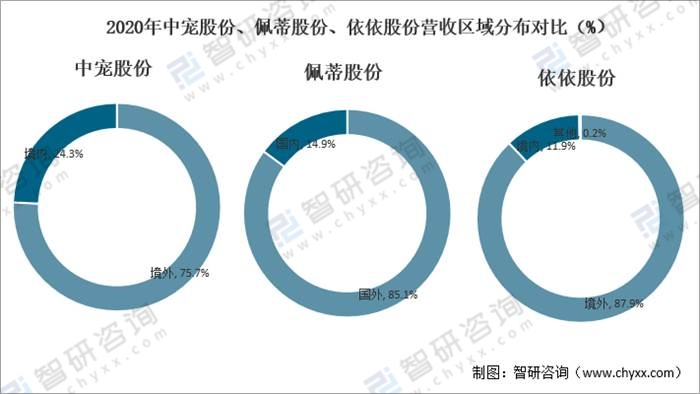 從營(yíng)收區(qū)域分布來(lái)看,2020年中寵股份、佩蒂股份、依依股份營(yíng)業(yè)收入主要來(lái)源于境外,2020年中寵股份境外營(yíng)業(yè)收入為16.91億元,占營(yíng)業(yè)總收入的75.7%;佩蒂股份國(guó)外營(yíng)業(yè)收入為11.41億元,占營(yíng)業(yè)總收入的85.1%;依依股份境外營(yíng)業(yè)收入為10.91億元,占營(yíng)業(yè)總收入的88%。