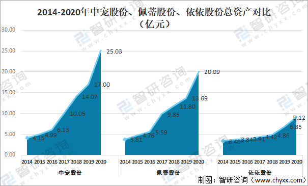 2014-2020年中寵股份、佩蒂股份、依依股份總資產(chǎn)對(duì)比(億元)