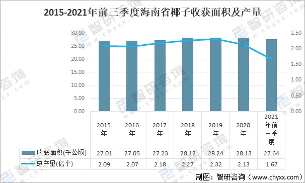 2015-2021年前三季度海南省椰子收獲面積及產量