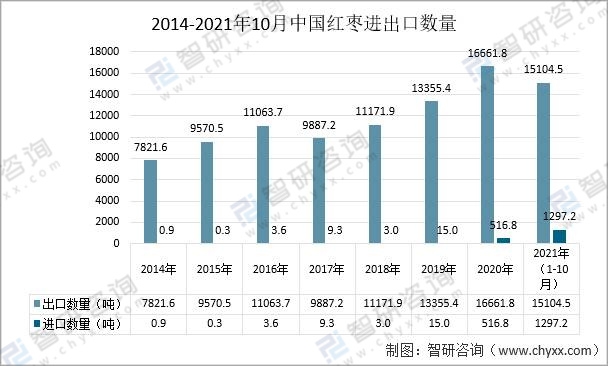紅棗近幾年進出口數量持續上漲,2020年紅棗的出口數量為16661.8噸,相比2019年出口數量的13355.4噸增加了3306.4噸,同比上升了24.76%。進口數量這兩年劇烈增加,2020年中國紅棗的進口數量為516.8噸,相比2019年的15噸增加了501.8噸,是2019年進口數量的33倍多。2021年1-10月紅棗的出口數量為15104.5噸,進口數量為1297.2噸。總體來看,我國紅棗以出口為主,出口數量遠大于進口數量。