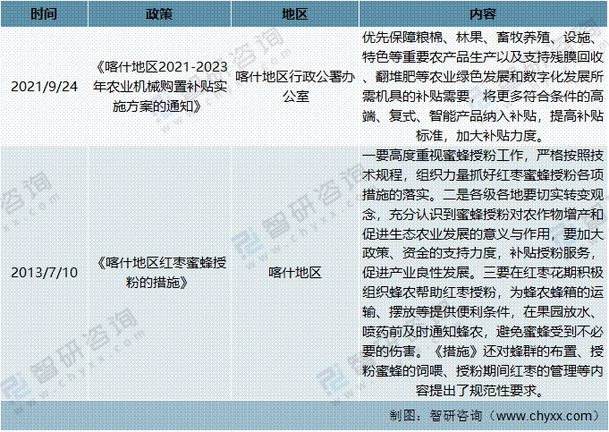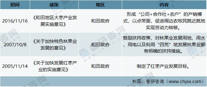 新疆紅棗主要分布在和田、喀什、阿克蘇、巴州和東疆的吐魯番、哈密等地,地方政府為扶持紅棗產業特色、保障農業穩定發展和農民增收制定了相關政策。