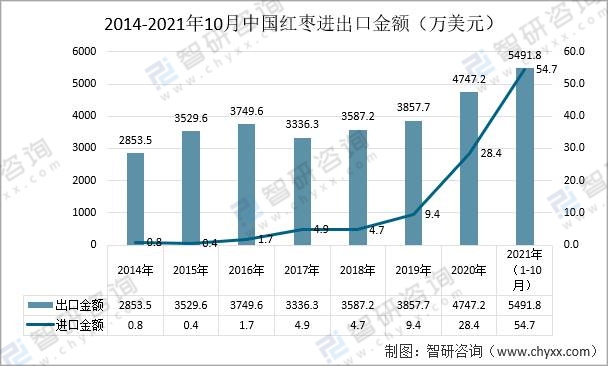據中國海關進出口數據,中國紅棗的進出口金額也在不斷增加。2020年中國紅棗進口金額為28.4萬美元,相比2019年增加了19萬美元,同比增長了202.13%。2020年出口金額為4747.2萬美元,相比2019年增加了889.5萬美元,同比上升了23.06%。2021年1-10月紅棗的出口金額為5491.8萬美元,進口金額為54.7萬美元。因此,中國紅棗出口大于進口。