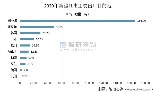 中國海關資料顯示,新疆紅棗主要出口目的地有中國臺灣、阿聯酋、韓國、日本、也門、加拿大、越南、荷蘭、德國和美國。其中,中國臺灣為主要出口地區,2020年新疆紅棗出口到臺灣的數量為164.76噸,占比新疆出口總數量的53.10%。