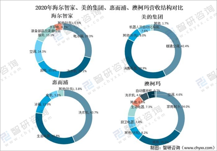 2020年海爾智家、美的集團、惠而浦、澳柯瑪營收結構對比(%)