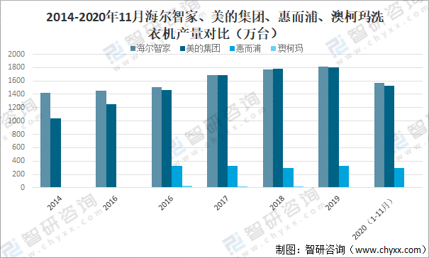 2014-2020年11月海爾智家、美的集團、惠而浦、澳柯瑪洗衣機產量對比(萬臺)
