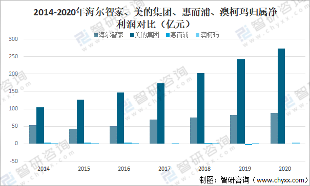 2014-2020年海爾智家、美的集團、惠而浦、澳柯瑪歸屬凈利潤對比(億元)