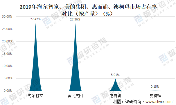從洗衣機市場占有率來看,2019年海爾智家和美的集團市場占有率遙遙領先,2019年海爾智家洗衣機產量占全國洗衣機總產量的27.42%;美的集團洗衣機產量占全國洗衣機總產量的27.36%;惠而浦洗衣機產量占全國洗衣機總產量的5.01%;澳柯瑪洗衣機產量占全國洗衣機總產量的0.15%。