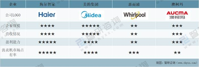 美的集團在企業(yè)規(guī)模和營收情況方面均優(yōu)于海爾智家、惠而浦和澳柯瑪,海爾智家在盈利能力和洗衣機市場占有率方面均優(yōu)于美的集團和惠而浦、澳柯瑪,總體來看,海爾智家和美的集團優(yōu)勢明顯。