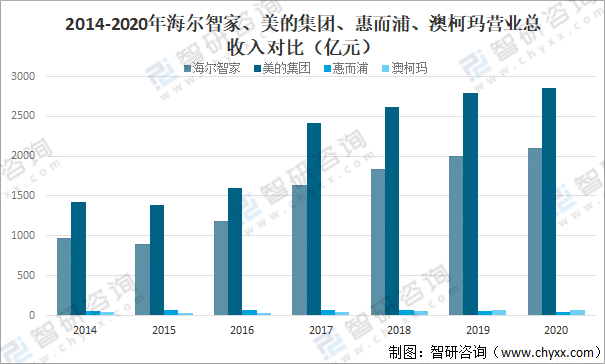 2014-2020年海爾智家、美的集團、惠而浦、澳柯瑪營業(yè)總收入對比(億元)