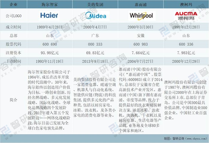 經過多年的發(fā)展,中國洗衣機生產企業(yè)遍地開花,一大批優(yōu)秀的洗衣機企業(yè)迅速崛起,逐漸成為洗衣機行業(yè)中的翹楚,如海爾智家、美的集團、惠而浦、澳柯瑪等,從成立時間和上市時間來看,海爾智家成立時間和上市時間要早于美的集團、惠而浦和澳柯瑪,美的集團總部在廣東,惠而浦總部在安徽,海爾智家和澳柯瑪總部均在在山東。