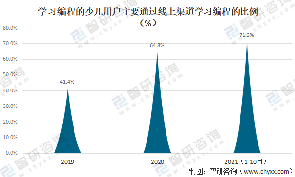 近年來中國少兒編程學習線上化趨勢愈發明顯,超七成少兒主要通過線上渠道獲取編程知識,2021年1-10月中國學習編程的少兒用戶主要通過線上渠道學習編程的比例達71.3%,較2019年的41.4%增長了29.9%。
