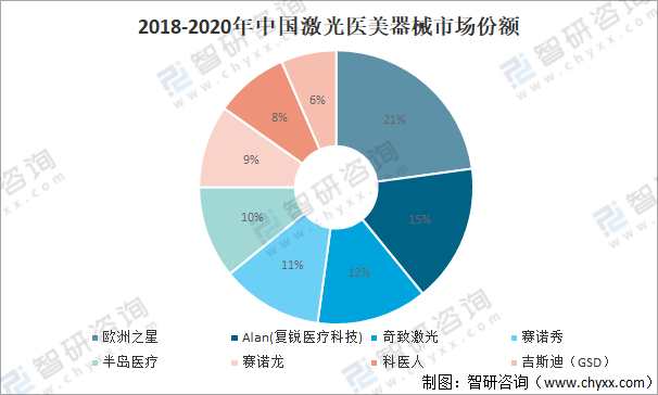 激光醫(yī)美器械是光電醫(yī)美器械市場最大的子行業(yè),市場已完成行業(yè)整合,競爭格局較為穩(wěn)定,中國公司市場占有率已較高。2018-2020年期間,中國激光醫(yī)美器械市場份額份額最大的是歐洲之星(21%);其次是復銳醫(yī)療科技(15%);第三是中國的奇致激光(12%),賽諾秀、半島醫(yī)療、賽諾龍、科醫(yī)人、吉斯迪(GSD)市場份額依次為11%、10%、9%、8%、6%。