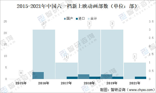 2016年、2018年、2019年中國六一檔新上映國產(chǎn)動畫部數(shù)分別為3部、2部、2部,2017年、2018年、2019年、2021年六一檔新上映進口動畫各1部。