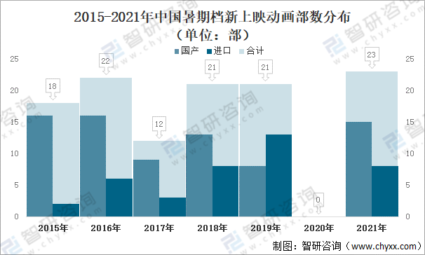 近幾年,2020年因疫情影響除外,中國暑期檔新上映動畫基本在20部左右,2021年中國暑期檔新上映動畫23部,其中新上映國產(chǎn)動畫電影15部,新上映進口動畫電影8部。