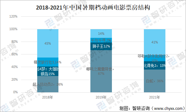 2018-2021年中國暑期檔動畫電影票房結構
