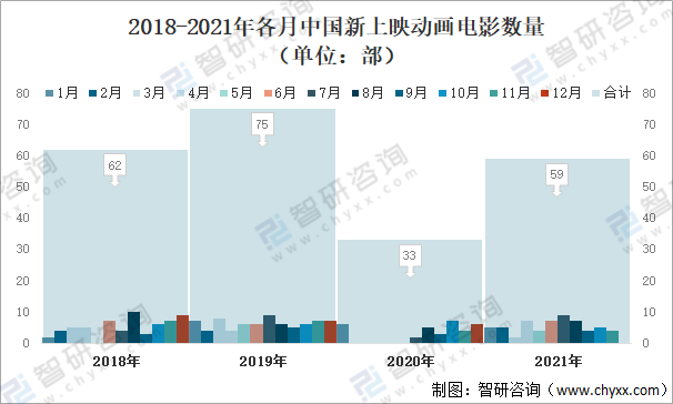 2018-2021年各月中國新上映動畫電影數(shù)量(單位:部)