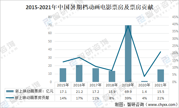 2015-2021年中國暑期檔動畫電影票房及票房貢獻