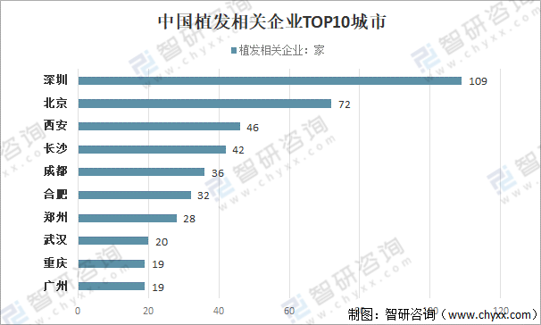從城市分布來看,目前,深圳市擁有的植發相關企業是全國城市中最多的,達109家,占廣東省的61%。北京、西安、長沙、成都、合肥、鄭州、武漢、廣州、重慶分別有植發相關企業72家、46家、42家、36家、32家、28家、20家、19家、19家。