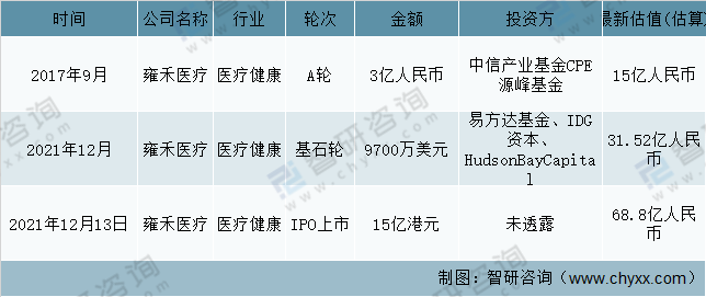 雍禾醫療創建于2005年,是植發領域的早期入局者,2013年雍禾醫療開始進行全國業務布局。2017年雍禾醫療獲得投融資中信產業基金、CPE源峰基金A輪融資,3億元;2021年12月獲得易方達基金、IDG資本、HudsonBayCapital基石輪融資9700萬美元,IPO上市金額15億港元。
