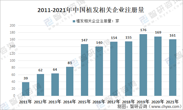 巨大的市場需求帶動了市場的發展,從2011年開始,植發在國內日漸火爆,手術量每年以翻番、翻幾番的方式暴增。中國植發產業從2015年開始崛起,2015年中國植發相關企業注冊量147家,創歷史新高;截止目前,中國植發相關企業注冊量為161家。