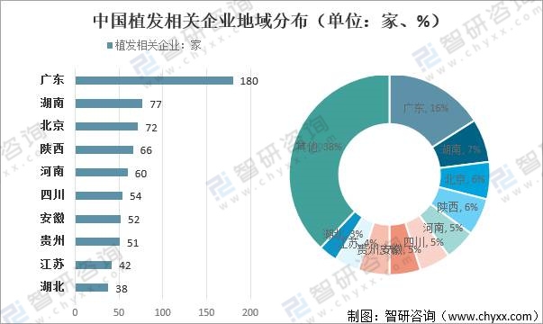 從植發相關企業地域分布來看,目前,中國廣東省有植發相關企業180家,居全國之首;其次是湖南省,有植發相關企業77家;位居全國第二;第三是北京市,有植發相關企業72家;陜西省、河南省、四川省、安徽省、貴州省、江蘇省、湖北省依次擠進全國前十。