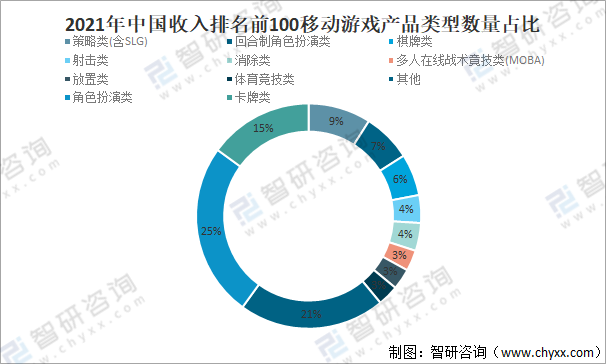 2021年中國收入前100移動游戲產品類型收入占比
