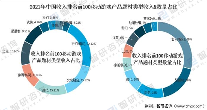 2021年中國收入排名前100移動游戲產品題材類型收入&數量占比