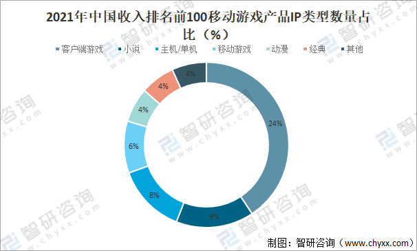 2021年在收入前100移動游戲產品IP類型收入占比中,收入占比最高的是自創IP,占比為42.46%。另有32%、8.33%和8.27%的IP類型收入分別由客戶端游戲、小說和主機/單機游戲改編而來的產品提供。總收入與IP的總數量基本呈正比。