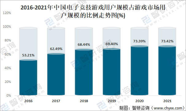 中國電子競技游戲用戶規模占游戲市場用戶規模的比例逐年攀升,2021年中國電子競技游戲用戶規模占游戲市場用戶規模的73.42%,較2016年的53.21%增長了20.21%。