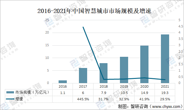 智慧城市經常與數字城市、感知城市、無線城市、智能城市、生態城市、低碳城市等區域發展概念相交叉,甚至與電子政務、智能交通、智能電網等行業信息化概念發生混雜。2021年中國智慧城市市場規模約為19.3萬億元,同比增長29.5%。