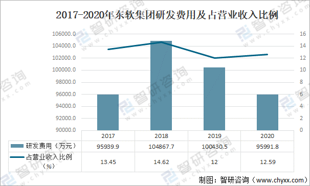 2017-2020年東軟集團研發費用及占營業收入比例