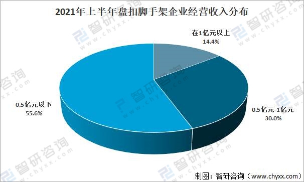 根據中國基建物資租貨承包協會對重點企業統計:55.6%的盤扣腳手架企業經營收入在0.5億元以下,30.0%的企業經營收入在0.5億元-1億元;經營收入在1億元以上的企業占比14.4%。