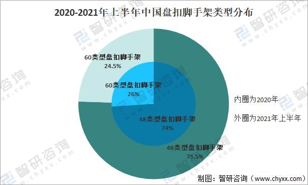 盤扣腳手架產品類型主要有φ48和φ60,市場主要以φ48為主,2021年上半年φ48在市場中占比75.5%,較2020年年底增加了1.5個百分點;φ60占比24.5%。
