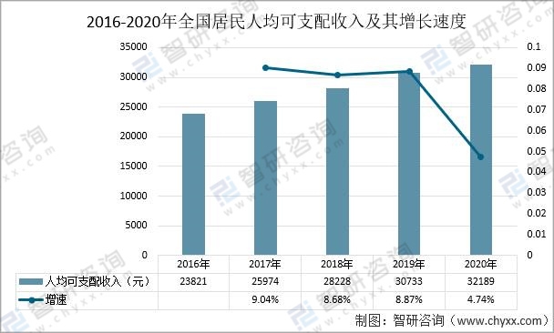 隨著社會的發展和全國居民人均可支配收入的增加,人們對子女的受教育水平也越來越重視。2020年人均可支配收入為32189元,同比2019年增漲了4.74%。