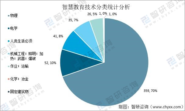從申請專利技術分類來看,物理專利技術占比最高。截止2021年,在“智慧教育”專利技術申請量中,物理專利申請量為359個,占“智慧教育”總申請量的90%;電學專利申請量為52個,占“智慧教育”總申請量的10%;人類生活必須專利申請量為41個,占“智慧教育”總申請量的8%;機械工程、照明、加熱等專利申請量為35個,占“智慧教育”總申請量的7%;作業/運輸專利申請量為26個,占“智慧教育”總申請量的5%。