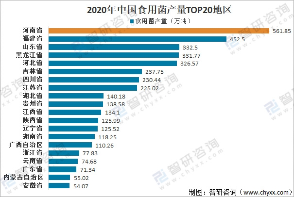 2020年中國食用菌產量TOP20地區
