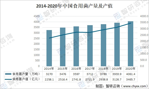 中國是食用菌生產第一大國,近年來,中國食用菌產業獲得了較快的發展,產量及產值均不斷增長,2014-2020年期間,食用菌產量由3270萬噸增加至4061.4萬噸,產值由2258.1億元增加至3465.7億元。食用菌產業是非耕地生產、農業生產廢棄物循環利用、經濟效益高、市場潛力大、建設資源節約型和環境友好型產業,具有不與人爭糧、不與糧爭地、不與地爭肥、不與農爭時、不與其他產業爭資源的“五不爭”特點。