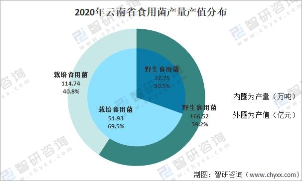 云南省是我國重要的食用菌生產地之一,全國70%以上野生菌產品為云南生產。近年來,云南食用菌依托環境優勢,生產模式和經營形式不斷 轉型提升,呈現出品種多樣化發展態勢。2020年云南省野生食用菌產量22.75萬噸,產值166.52億元。栽培食用菌產量51.93萬噸,產值114.74億元。