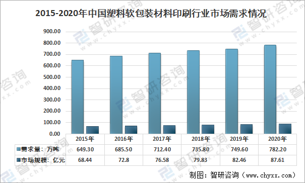 近年來,國內(nèi)塑料軟包裝材料印刷行業(yè)市場需求平穩(wěn)增長,從2015年的649.3萬噸增長到了2020年的782.2萬噸。2020年我國塑料軟包裝材料印刷規(guī)模87.61億元,同比2019年的82.46億元增長了6.25%。